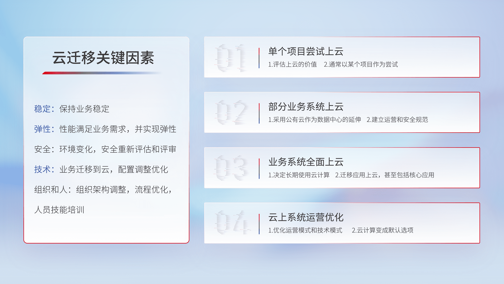 结合实际业务,,,从规划设计、、云平台选型、、云原生改造、、、数据迁移、、、、集成交付,,,,迁移全过程为客户识别最佳上云路径,,,做好风险识别管理,,,设计网络架构、、、身份权限、、、安全审计合规、、、、操作审计、、、日志审计、、监控告警策略、、、、多站点容灾设计等,,对云上基础设施进行整体规划,,,提升IT治理水平,,以满足弹性、、、高可用、、、、高性能的需求。。。