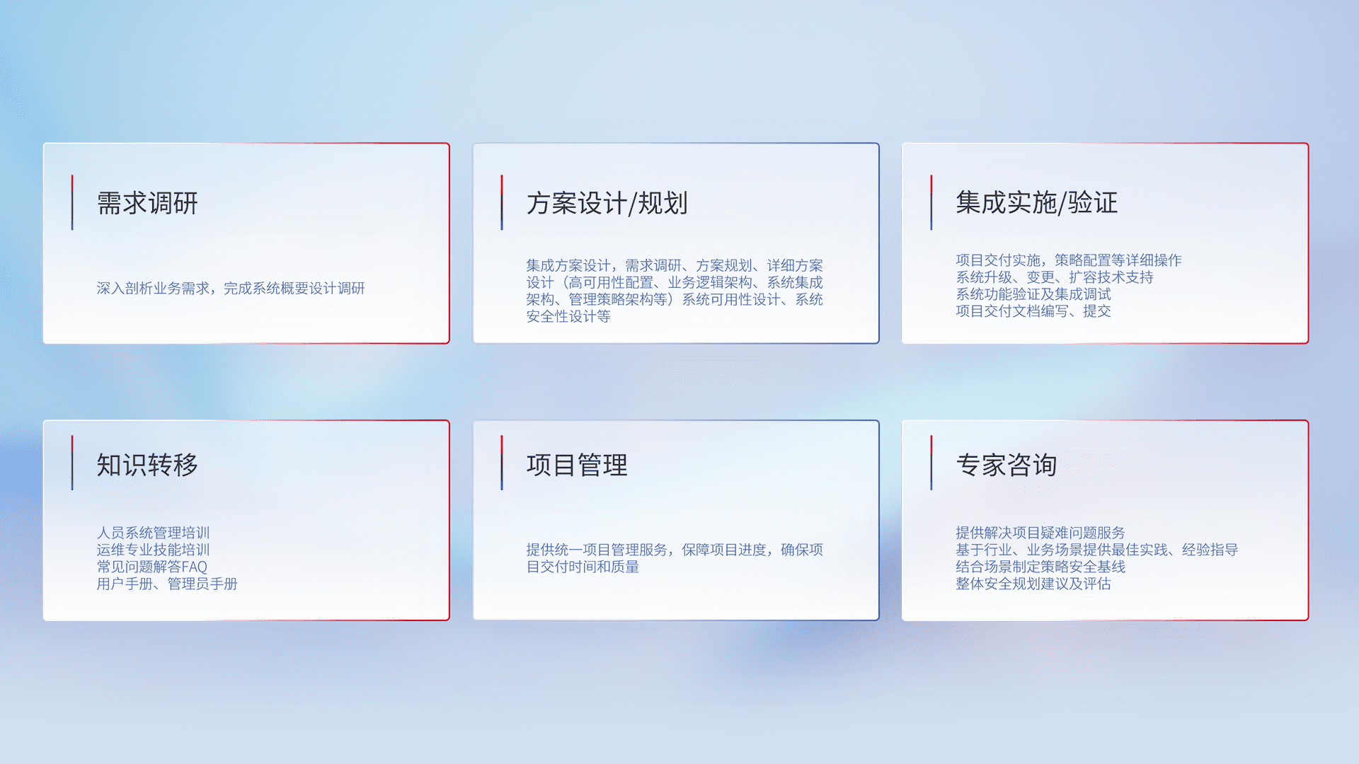 针对客户行业特性,,将宏观的安全战略和需求,,通过专业的交付服务,,,实现项目落地,,,为客户提供标准规范的集成交付服务。。